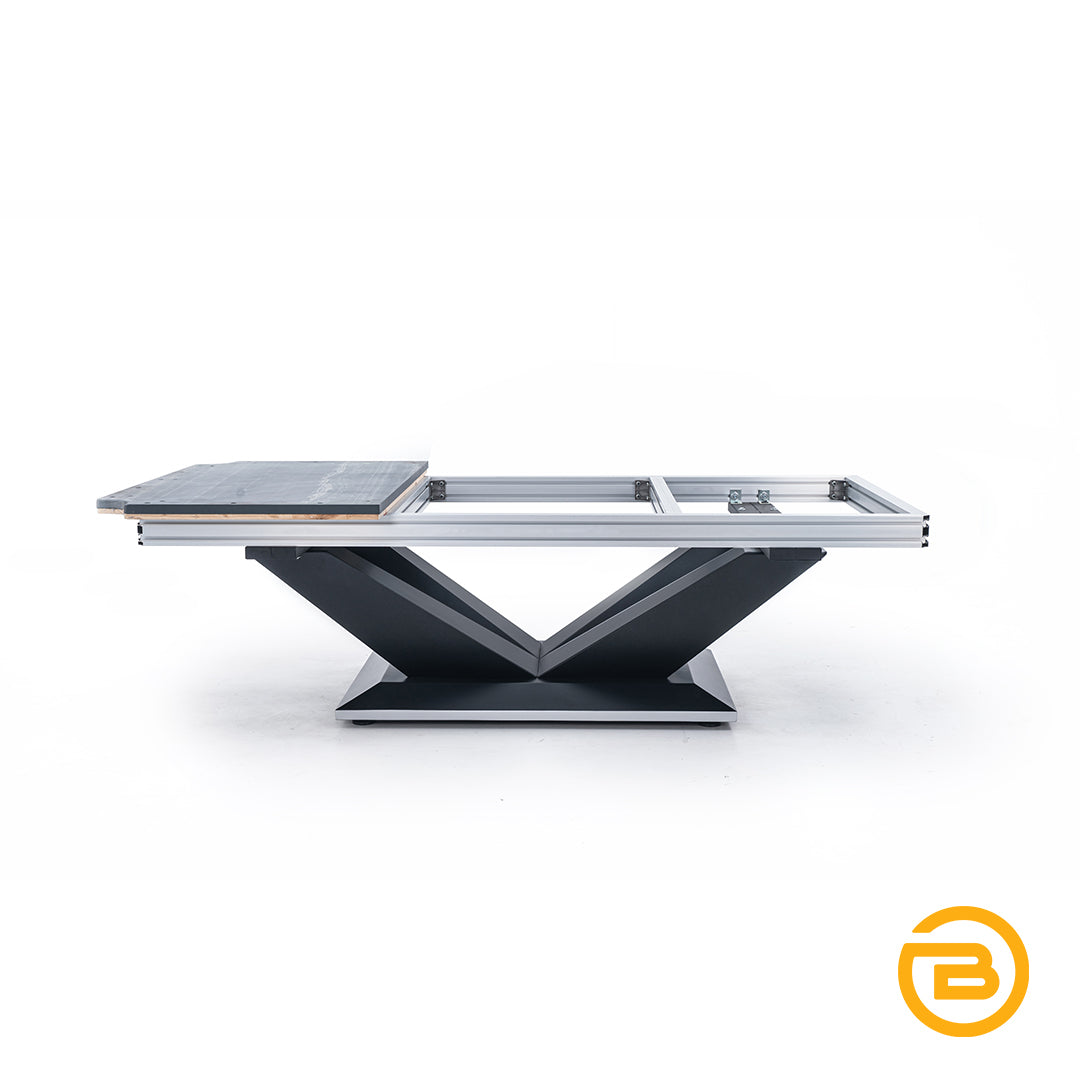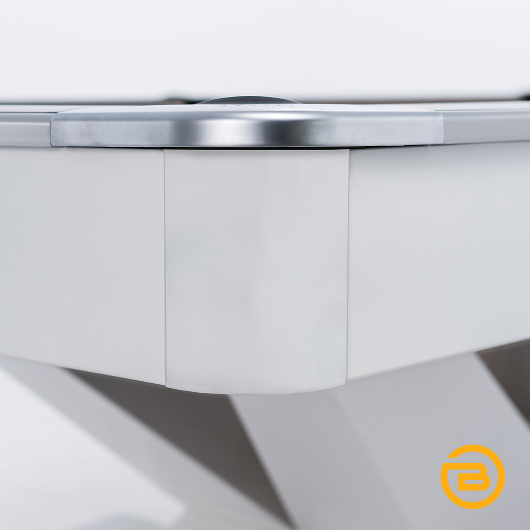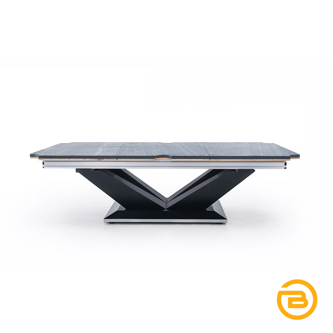 A tournament-grade powerhouse, the Victory II Plus boasts a signature “V”-style pedestal and legs, a patented Slate Leveling System (SLS) and Leg Leveling System (LLS), and TPR pockets for consistent performance. With precision‑cut 30 mm Rasson slate, aluminum support beams, Klematch P59 cushions, and luxury Adamath‑Wood rails resistant to warping, scratches, heat, and moisture, this table guarantees professional-level play and exceptional longevity.